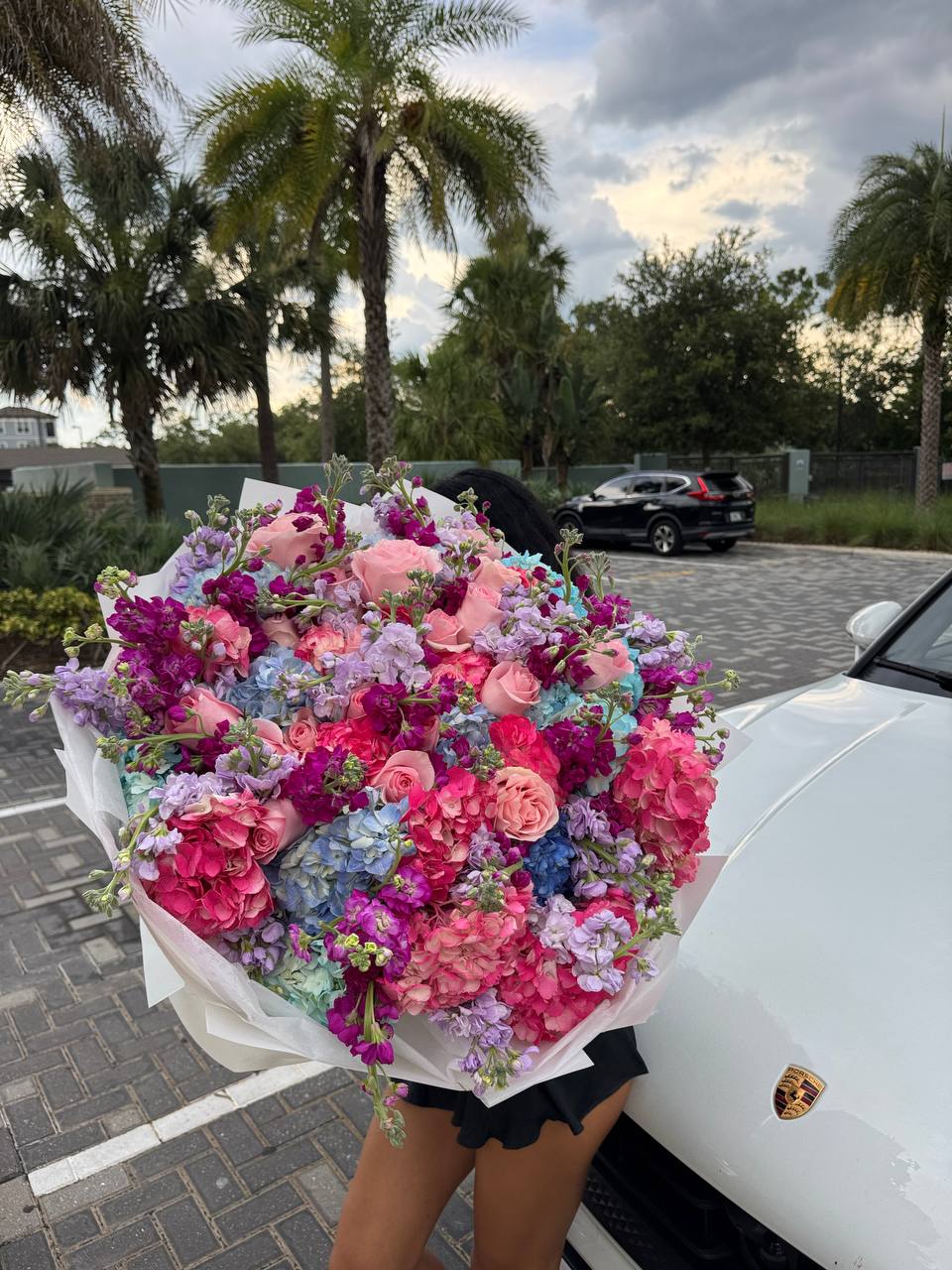 A lush, oversized garden‑style bouquet featuring pink and blue hydrangeas, soft pink roses, vibrant spray roses, and lilac stock flowers. A rich “berry mix” palette that feels romantic, textured, and irresistibly luxurious.