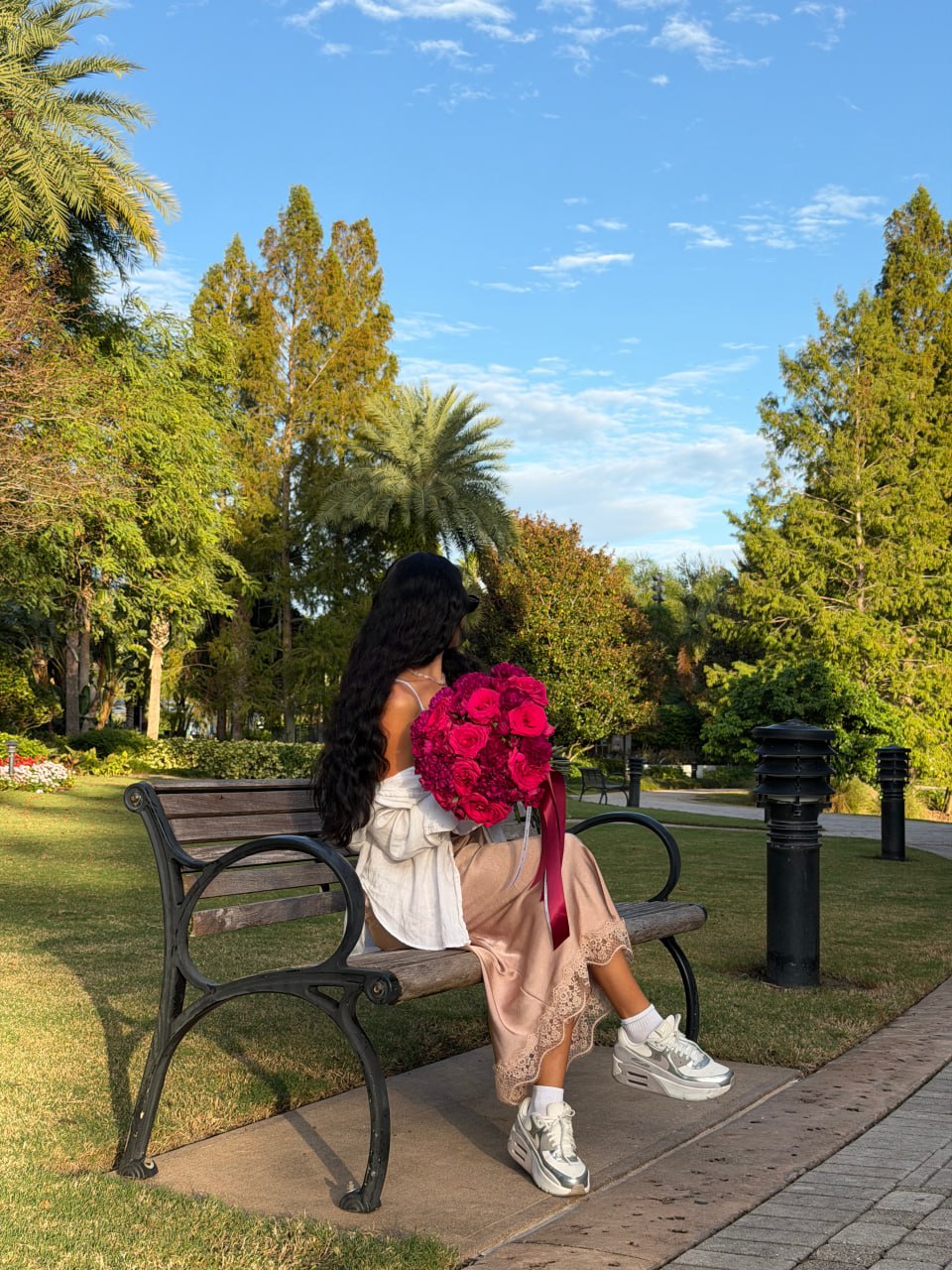 A bold bouquet of deep red roses, perfect for heartfelt declarations and serene outdoor moments.