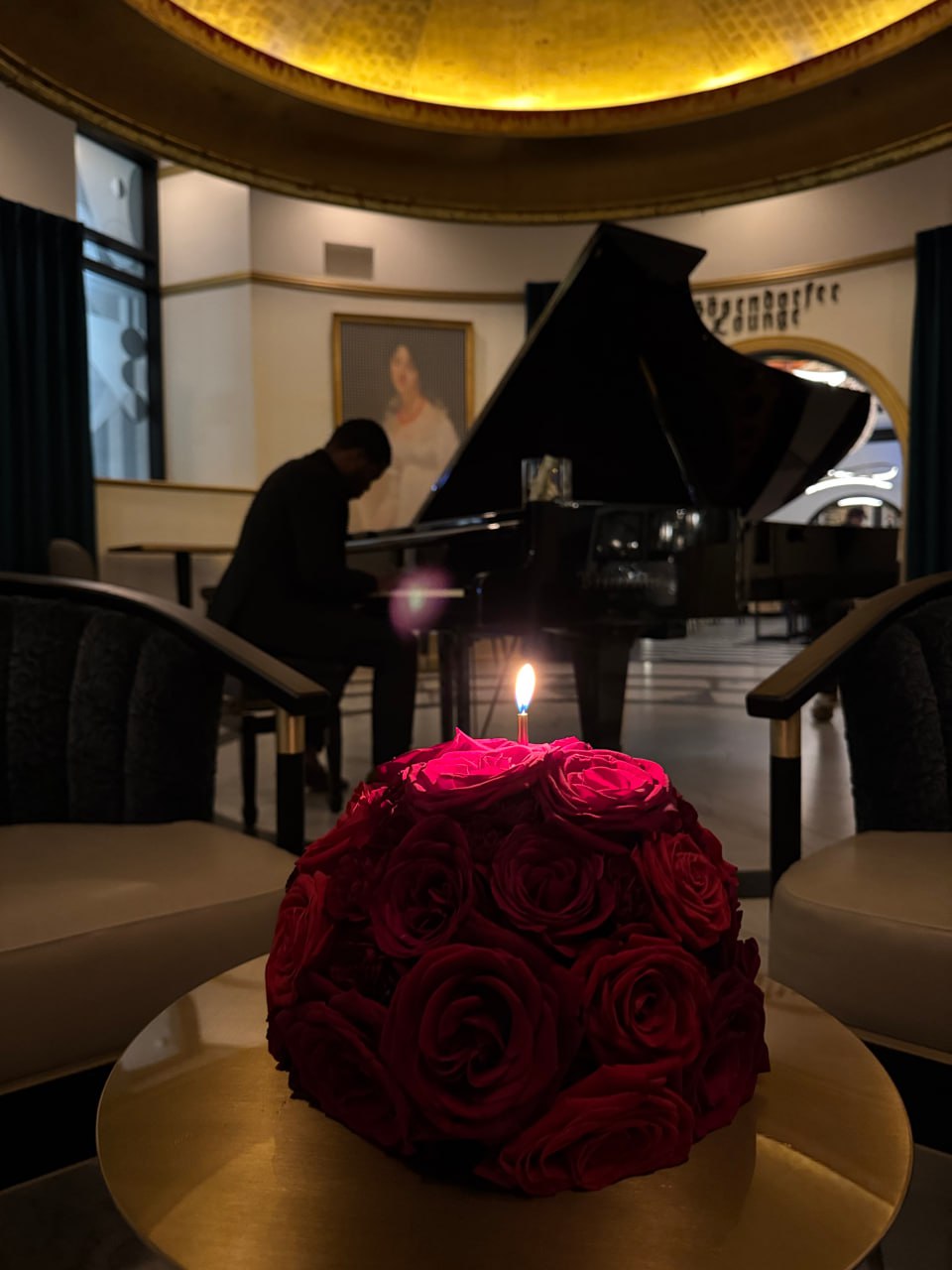 A dramatic dome of deep red roses crowned with a single candle. Intimate, bold, and unforgettable.