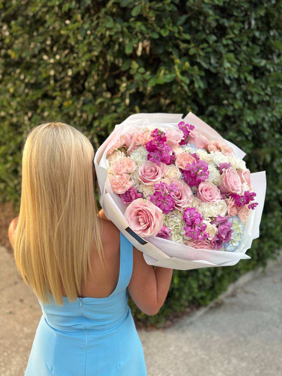 A poetic bouquet of roses, carnations, hydrangeas, and violet stock. Romantic, fresh, and expressive.