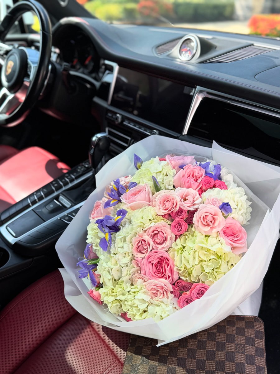 A graceful mix of pink roses, white hydrangeas, and violet irises. Elegant, expressive, and refined.