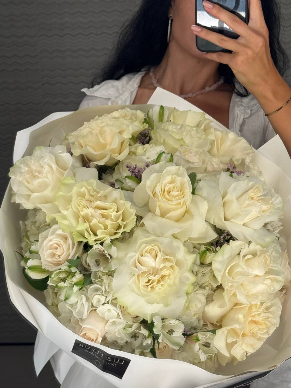 A grand bouquet of cream roses, white blooms, and soft foliage. Elegant, serene, and timeless.