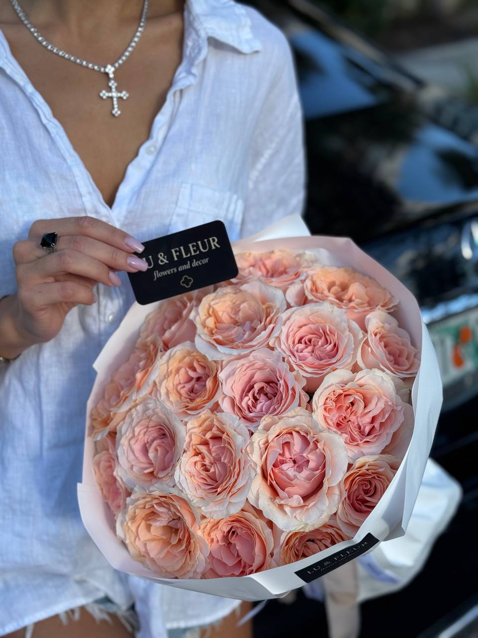 A delicate bouquet of peach-pink roses wrapped in crisp white paper. Soft, romantic, unforgettable.
